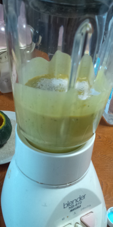 ついで、ミキサーにくりぬいたかぼちゃ、卵、コンデースミルク、クリームチーズを分量と睨めっこしつつ入れる。