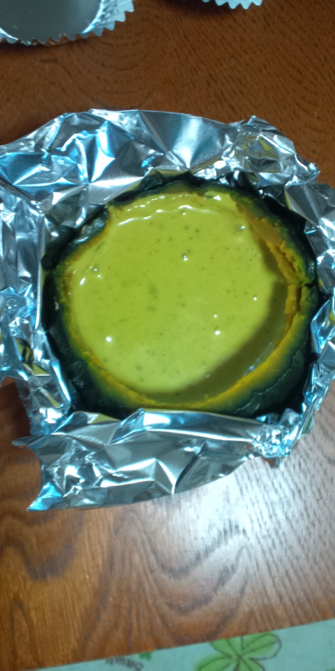 レシピよりかぼちゃが小さいので、どうしようか迷ったけど、コンデースミルクとチーズケーキは分量どおり入れました。卵もか。一個じゃ減らしようないから。